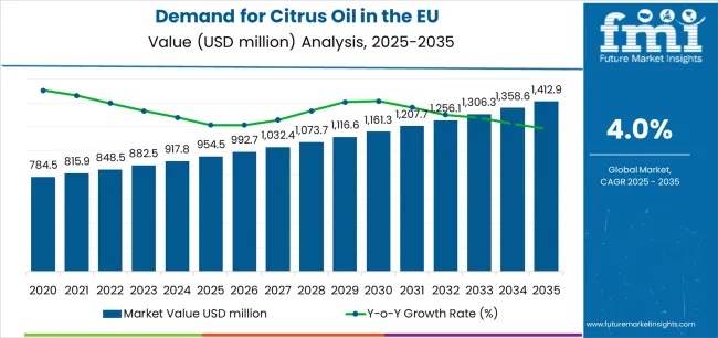 NEWARK, DE, UNITED STATES, November 13, 2025 /EINPresswire.com/ -- The European citrus oil market is projected to grow from USD 954.5 million in 2025 to approximately USD 1,412.9 million by 2035, recording a total growth of 47.8% at a CAGR of 4%. According to the FMI Food Intelligence Database, the market will expand nearly 1.5X during the period, fueled by increasing consumer preference for natural ingredients, the rising popularity of aromatherapy, and expanding use across food, beverages, personal care, and home care sectors.