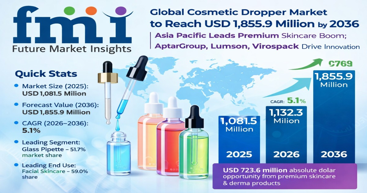 NEWARK , DE, UNITED STATES, April 1, 2026 /EINPresswire.com/ -- The global cosmetic dropper market, valued at USD 1,081.5 million in 2025, is projected to grow to USD 1,132.3 million in 2026 and reach USD 1,855.9 million by 2036, expanding at a CAGR of 5.1% during the forecast period. This growth trajectory reflects a structural shift toward precision dosing in high-potency skincare formulations, where droppers are no longer just packaging components but critical tools for formulation integrity, dosage control, and premium brand positioning. The market is expected to generate an absolute dollar opportunity of USD 723.6 million, driven by rising adoption of serums, facial oils, and dermaceutical products.