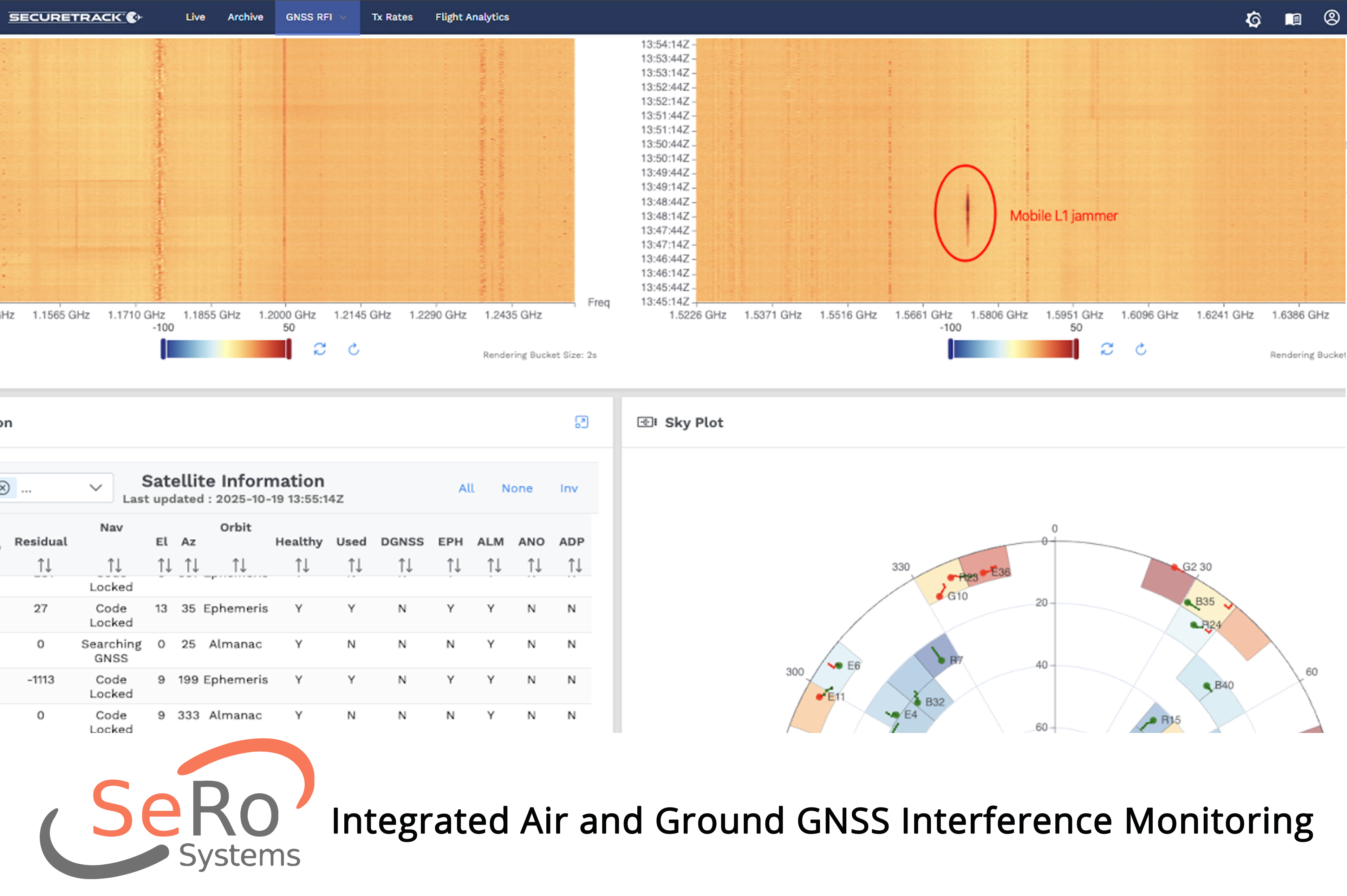 FRANKFURT, GERMANY, October 20, 2025 /EINPresswire.com/ -- SeRo Systems, a leader in air traffic surveillance security and monitoring solutions, has introduced a new ground monitoring capability to its SecureTrack solution, enabling unified air- and ground-based detection of GNSS interference, including jamming and spoofing. This comprehensive feature delivers real-time detection, analysis, and visualization of jamming and spoofing activity across all GNSS frequency bands and constellations in a single integrated solution. Compliant with the latest EASA and ICAO monitoring recommendations, it also offers data archival and analytics capabilities for detailed reporting. The company started rolling out this feature to users in Eastern Europe and the Baltics last week.