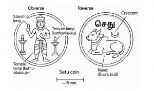 Setu coins are copper issues struck by the Aryacakravarti kings of Jaffna (Yalppanam). The obverse typically shows a standing ruler flanked by temple lamps. The reverse shows Nandi (the bull of Siva) with a crescent above and the Tamil legend “செது” (Setu). The legend references Rama Setu (Adam’s Bridge) and the royal biruda Setukavalan or “Guardian of the Setu,” linking Jaffna’s rulers to the sacred center of Rameswaram and to older Pandyan claims across the strait.