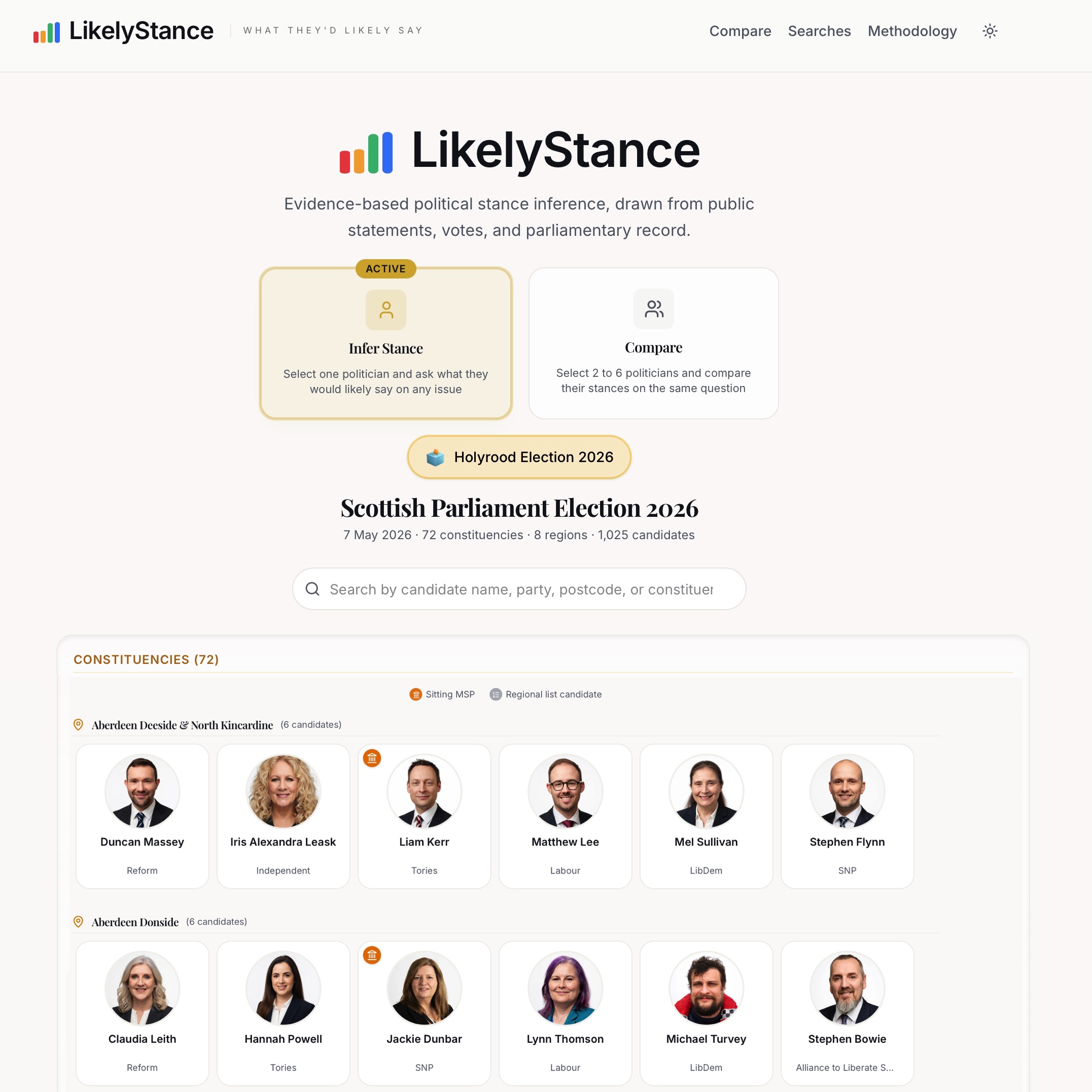The new platform allows users to compare candidates on the issues that matter most, from healthcare and housing to transport, education, and the future of Scotland. Users can enter a specific question or topic area, then explore what an individual candidate is likely to believe based on their recorded statements, or compare multiple candidates side by side to see where their positions align, differ, or directly conflict. It brings together a vast body of political material and translates it into clear, structured insights that make complex positions instantly understandable.